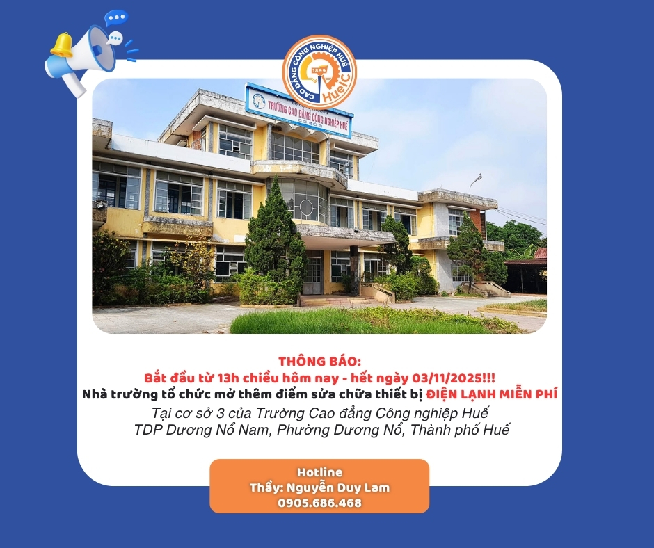 Nhằm kịp thời hỗ trợ bà con khắc phục hậu quả sau mưa lũ, Trường Cao đẳng Công nghiệp Huế tiếp tục mở thêm điểm sửa chữa thiết bị điện lạnh miễn phí.