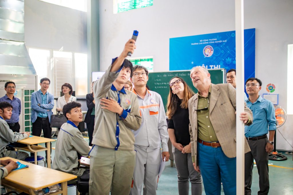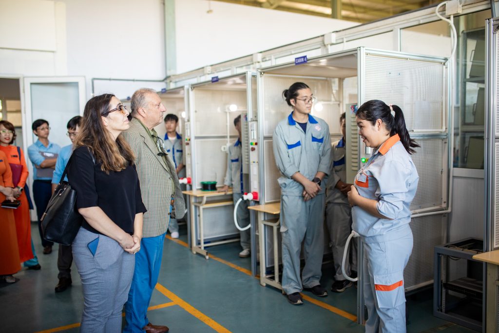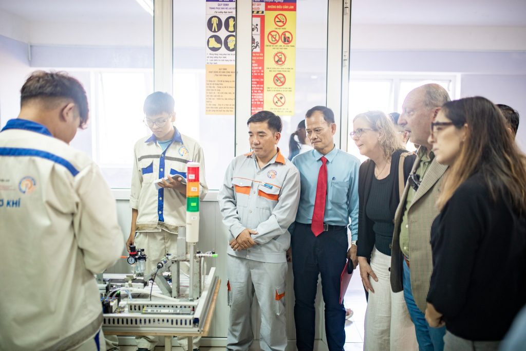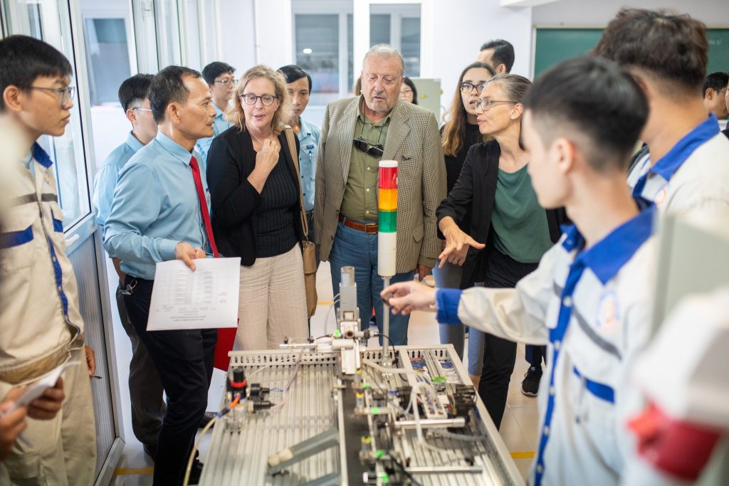 Trong khuôn khổ chương trình, đoàn đã đến tham quan các xưởng thực hành Cơ điện tử, Điện công nghiệp, Điện lạnh và Năng lượng tái tạo – nơi nhiều thiết bị hiện đại do GIZ tài trợ đang được khai thác hiệu quả, trực tiếp phục vụ cho hoạt động giảng dạy và học tập.