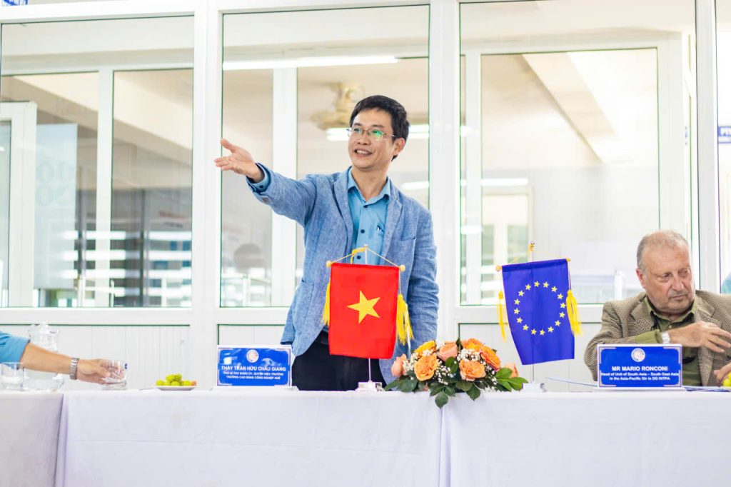 Phát biểu tại buổi làm việc, Thầy Trần Hữu Châu Giang – Quyền Hiệu trưởng nhà trường bày tỏ lời cảm ơn sâu sắc tới Liên minh Châu Âu và GIZ, khẳng định rằng sự đồng hành và hỗ trợ quý báu này đã góp phần quan trọng trong việc nâng cao chất lượng đào tạo, phát triển kỹ năng xanh và kỹ năng số cho sinh viên.